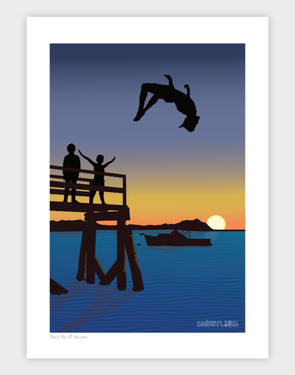Back flip off the pier Art Print
